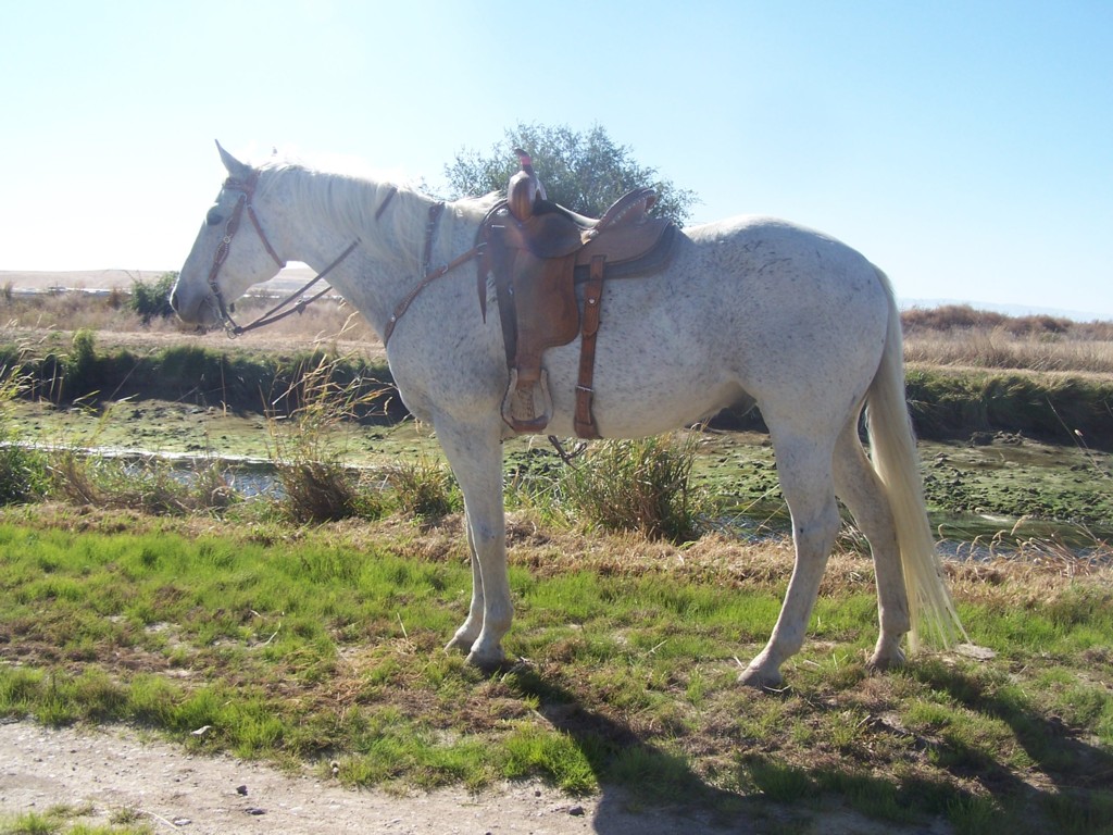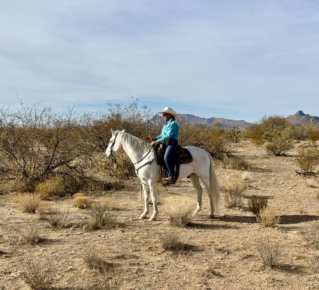 “Whitey” He’s versatile, he’s pretty, he’s smart and he’s priced to sell! Whitey has been hauled and worked in many different settings, most recently working as a pony on the racetrack. He’s been ridden on desert trails, in traffic, in the arena, at ropings, and at show practices. He is not bothered by other horses, noise, flapping tarps, cars, barking dogs, motorcycles or drama. He has really taken to arena work, especially trail class and patterns. He’d make a nice ranch versatility horse with just a little more practice. He has a pretty long trot, ground covering walk, and “the look” to catch the judge’s eye. Whitey has a solid foundation, he moves off your feet and seat like one should, open gates, drag a barrel, pony an unruly horse, or just have a fun safe walk down the trail. He would also be an all around ranch horse or finish him as a rope horse. 2015 grade gelding, about 15 hands, 1100 lbs. New shoes and ready to ride. Sold 1/12/2025