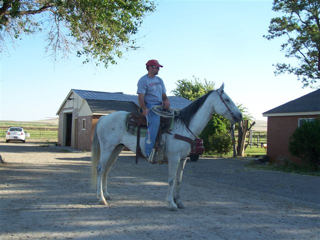 My son Joe purchased Smokey from you in Sept.08. I’ve been meaning to email and always get busy doing other things. Just want to let you know that Joe loves his horse. We all do for that matter. Smokey is so kind and honest. He forgives Joe for being 16 and is willing to do anything for him. When he first got here he acted really lost but once he settled in he was good. He had a hard time getting in with the other two geldings but now is great friends with the old guy. They play and Smokey keeps Poco young. Not long after Smokey came he got a cut on his left hock that the vet said to wrap it. I have never had to wrap a leg wound before especially on the hock and there I was in terrible windy, snowy, weather with my face between his back legs trying to do a good wrap and he was totally still and trusting of me. His cut has since healed but it’s nice to know he is easy to doctor. He is truly gentle. We’ve had a nasty, long, snow filled winter so Smokey hasn’t got used as much as I’m sure he was used to, but when Joe drags him out for a ride in the pasture in a foot of snow he goes along very willing. I don’t know how much snow Smokey worked in at his ranch in Nevada but he is great in it here. Late last fall Joe took Smokey on a couple brushy (and I mean brush where they had to crouch on top of their horses to get through) rides rounding up cows from summer pastures. Joe had a great time and Smokey was willing and went all day in the wind and rain. Right before Christmas he took Smokey to move cattle about 10 miles to our neighbors place down the road. They drove them right down the road in the snow keeping them out of driveways and together, with cars following and going around them. Smokey again proved himself and was great at his job. It made for a great picture in our local paper. Joe really want’s to send Leroy (Smokey’s previous owner) a newspaper picture. Would you be willing to get it to him or maybe we could send it directly to Leroy. Also if Leroy would be willing, we would love to have a picture of Smokey in his life before Joe got him. Joe said Smokey is the best money he has ever spent. Thank you so much.