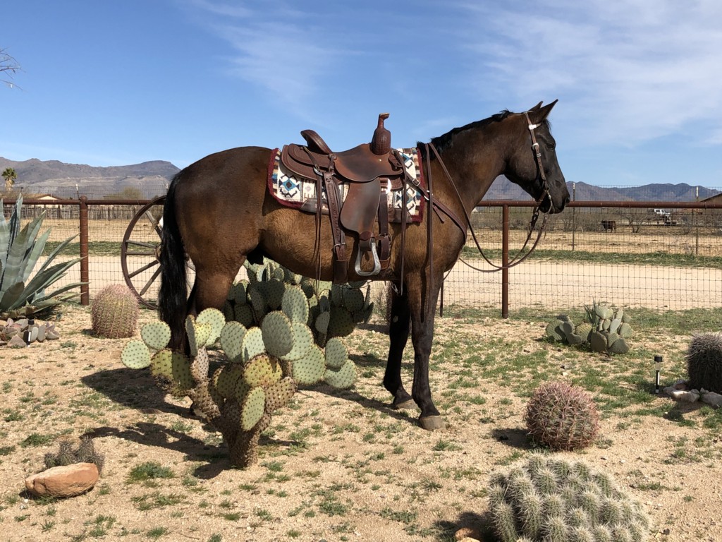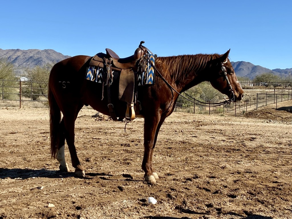 “Leonard” is a fun gelding with a million dollar personality He is 5 years old, 15.1 hands, sound, smart and ready to go to work. Leonard meets you at the gate every morning. He loves to be brushed, clipped, get a bath, load up and go. He was started right by an older Tucson rodeo couple, he has roped slow steers, sorted and gathered cattle, rode long days in the desert, stands tied, and wants to be your best friend. He has a nice ground covering walk and he is very comfortable to ride, he stands to be mounted and has great stamina on the trail. Leonard has his whole life ahead of him and he has potential to be a rope, ranch, barrel or trail horse. Sold 11/21/2020