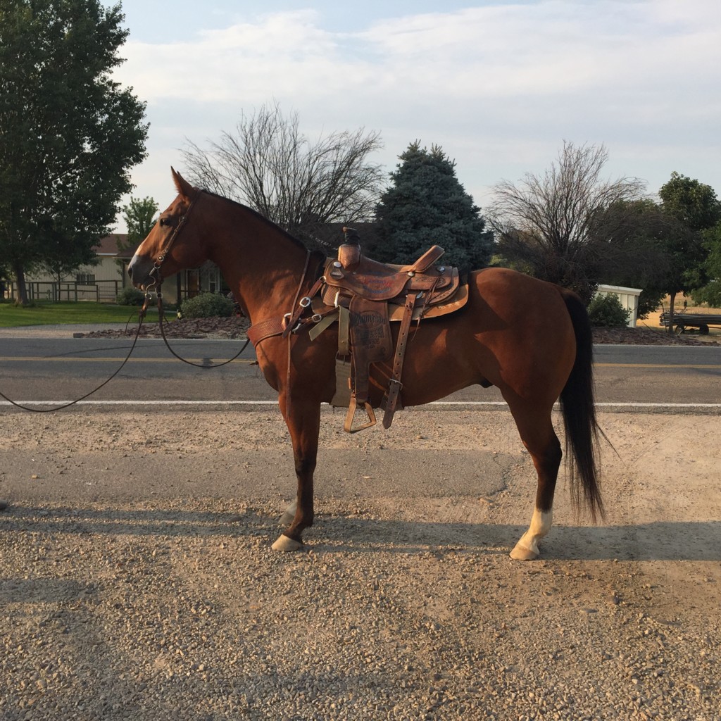“Speedy” – All around handy and cute AQHA 13 year old mare. Currently working at Wyoming Downs as a racetrack pony. She’s gentle, she’s broke, and she’s price to sell. UTD on everything, ready to run barrels, poles, and games. Suitable for kids, great high school rodeo or junior rodeo type horse, plus use her on the ranch or on the trail. Sold 7/30/2023