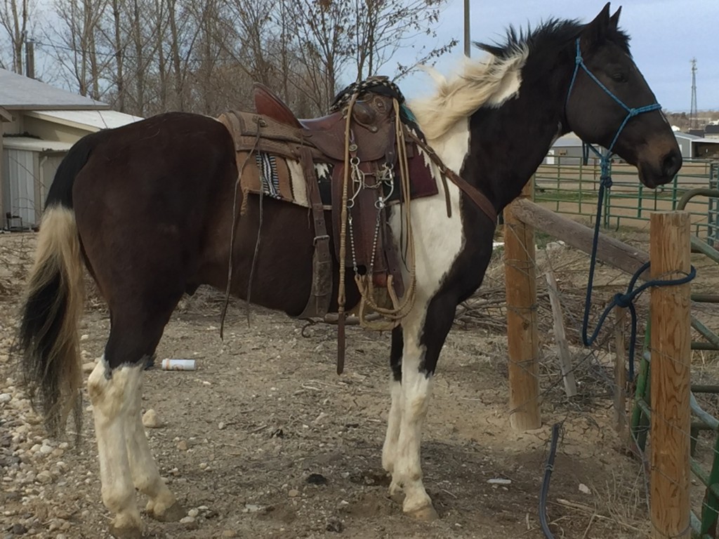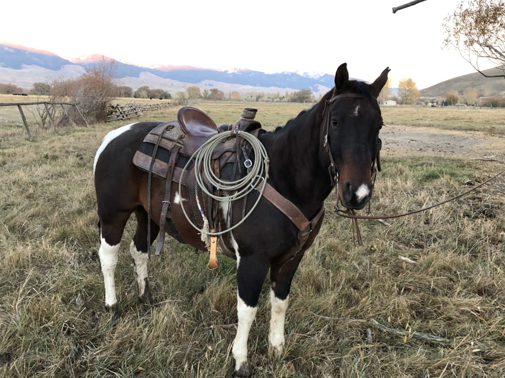 “Phone Tag” 5year old, Grade, Paint Gelding. Tag is suitable for riders seven to seventy. We use him for everything, and we have ridden him everywhere a horse can go. He was started and ridden for two years by a good Montana cowboy, so he’s experienced in all phases of ranch work. He has drug lots of calves to the fire. He is starting to make a nice breakaway and heel horse. Personality Plus. Cute and quiet. Sold