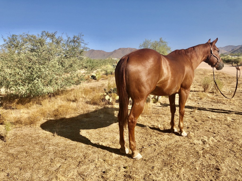 “Steele” – Grade 9 year old gelding. 15.1 hands. Steele is broke, pretty and gentle. He is ranch raised and he has been used extensively on desert and mountain trails. He has a nice ground covering walk and can go all day. Recently completed dental and wellness exam. He’s fit and ready to hit the trail. Great to clip, bathe, haul and shoe. Sold 5/1/2021