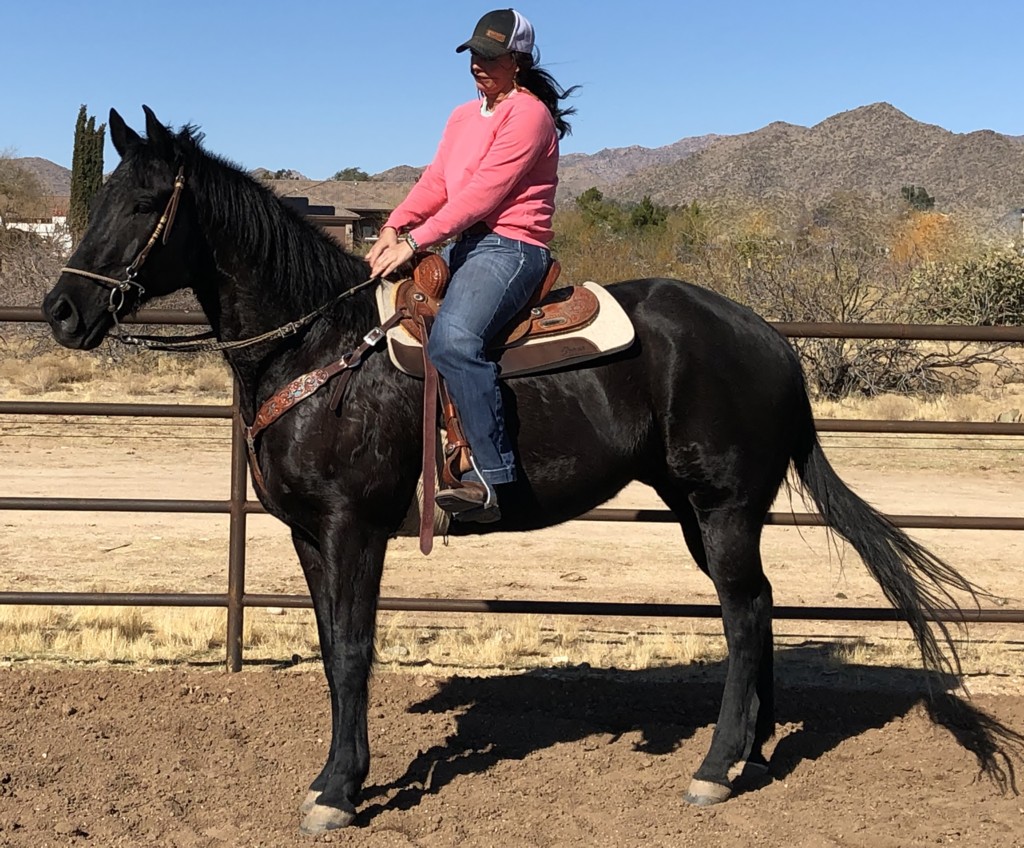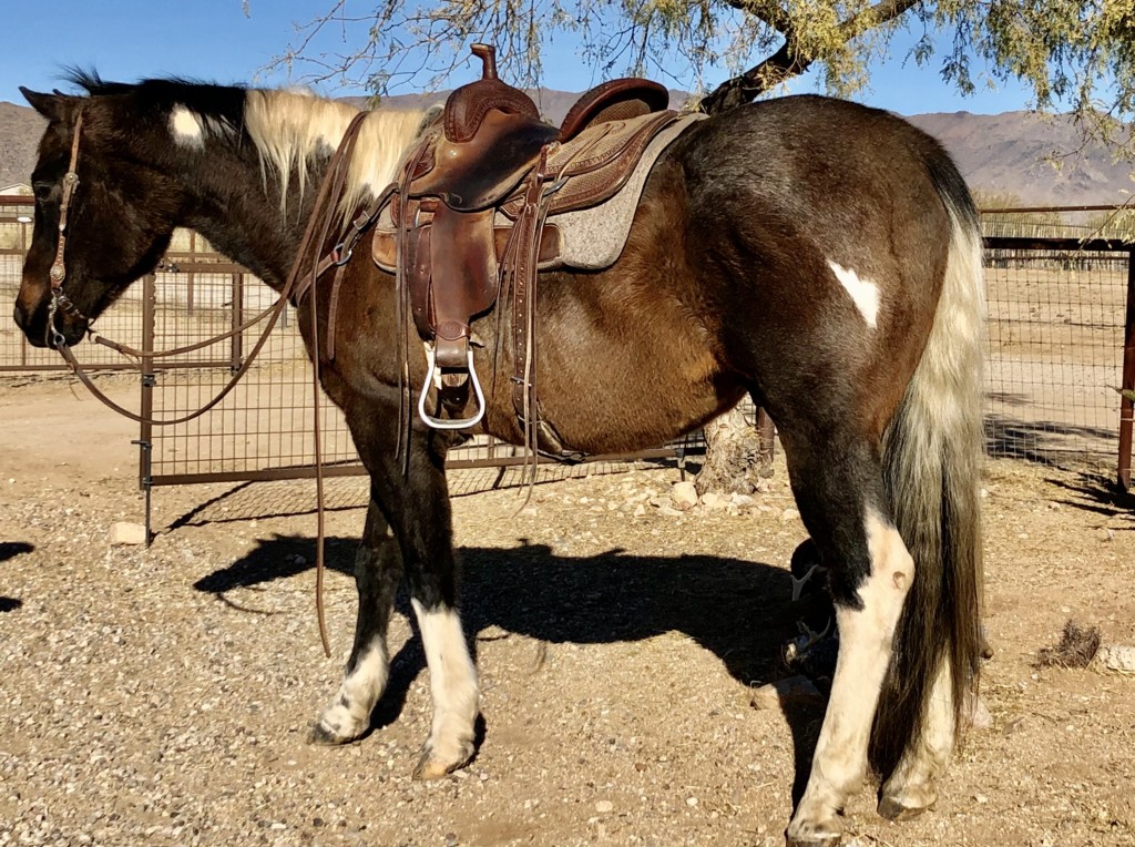 “Texaco” looks like a draft cross but he’s a registered paint with a big splash of pretty! His personality and gentle disposition shine as bright as his beautiful black coat. He is a super smooth ride, crosses water, not bothered by wildlife, dogs, the occasional Arizona rattlesnake, cactus or cars. I’ve ridden him on steep mountain trails in the Prescott National Forest and on sandy desert trails out my front gate. I can trust him; he crosses anything, opens and closes gates, stands to mount, and meet you at the gate every morning to go for a ride. I can put my friends from town on him and he takes care of them. Texaco is also a seasoned ranch horse, having spent most of his life on a remote Idaho cattle and timber operation. You can rope, gather, doctor, sort, and drag calves to the fire on Texaco all day long; he knows the drill and you won’t run out of horsepower. In the arena he is an eye-catching ranch versatility horse, he has a balanced lead departure, counter canter, and started flying lead changes. He shines in ranch trail and ranch rail classes. I plan to ride him in a parade or two before sale day and do some trail challenge competitions. He is clean legged, healthy, up to date on vaccines, farrier care, and had a dental in May, 2021. He stands 15.2 hands. I have really enjoyed riding, showing and training this gelding. He is ready for any job you have in store for him. Sold 7/17/2021