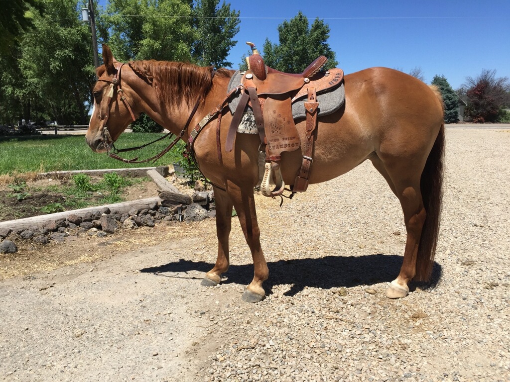 “Stripper”, Stripped N Smart, 2003 AQHA sorrel gelding. “Stripper” is a big, strong, good looking gelding that anyone will love to ride. By a good producing son of Streakin Six and out of a great old Tiger Leo mare, he comes by his good mind and athletic ability honestly. Owned by an Idaho cowboy who rides for a living and competed successfully in the PRCA. Extensive use in the branding pen, gathering in rough country, hunting camp, and in the feedlot. Rope anything on him, he’s been headed and heeled on and he could quickly be finished in to a nice team roping horse. Sold 11/24/13