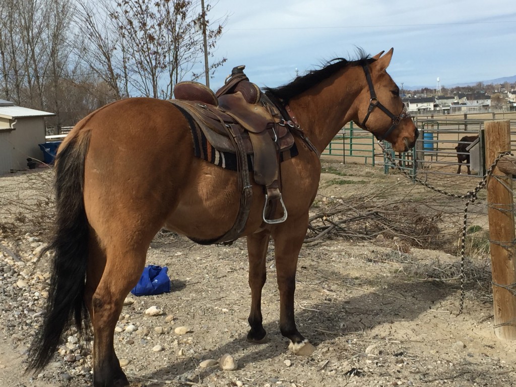 “Johnny”, 12/13 yr old grade gelding. 14.3 hands, stocky well built gelding with a kind eye and a great attitude. He is a very fast walker and a wonderful horse to trail ride. He’s an unusual, very pretty, brown/buckskin color with a long black mane and tail. He was not registered but has King breeding from an old Idaho ranch program. He looks like the poster horse for a high dollar ranch gelding sale. He has been used extensively as a ranch gelding, brand, gather, sort, pack dudes on holidays, hunting camp, and any horseback job. He would kick butt in the mountain trail challenges, then go team pen, rope, trail ride or ranch. He’s very cool. Sold 10/15/2013