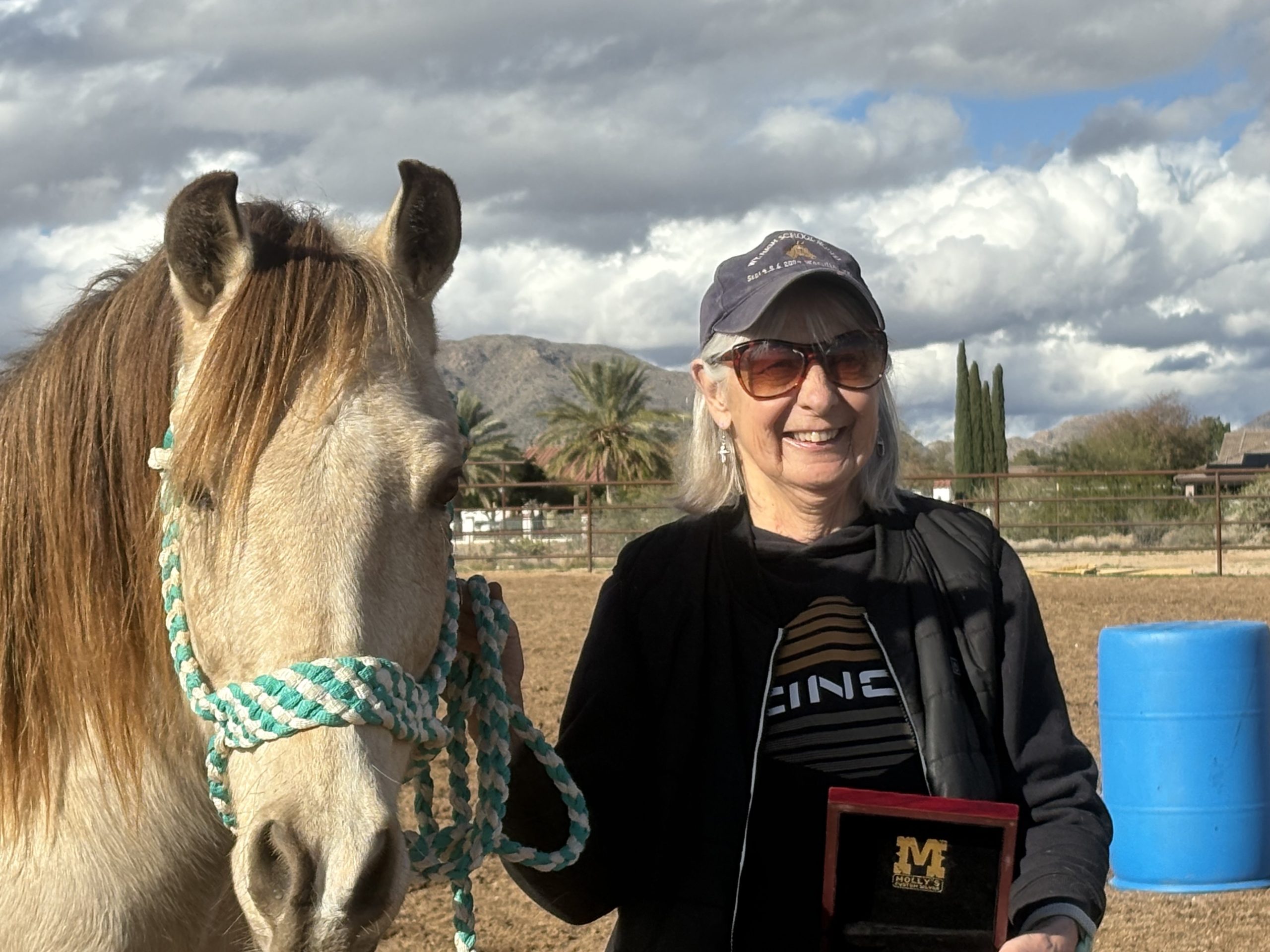 This month Rocky’s new owner arrived after a serious illness prevented her from traveling to Arizona for several months. We finally got to take a picture of Rocky, his new mom and his high seller buckle. Congratulations and Good luck.