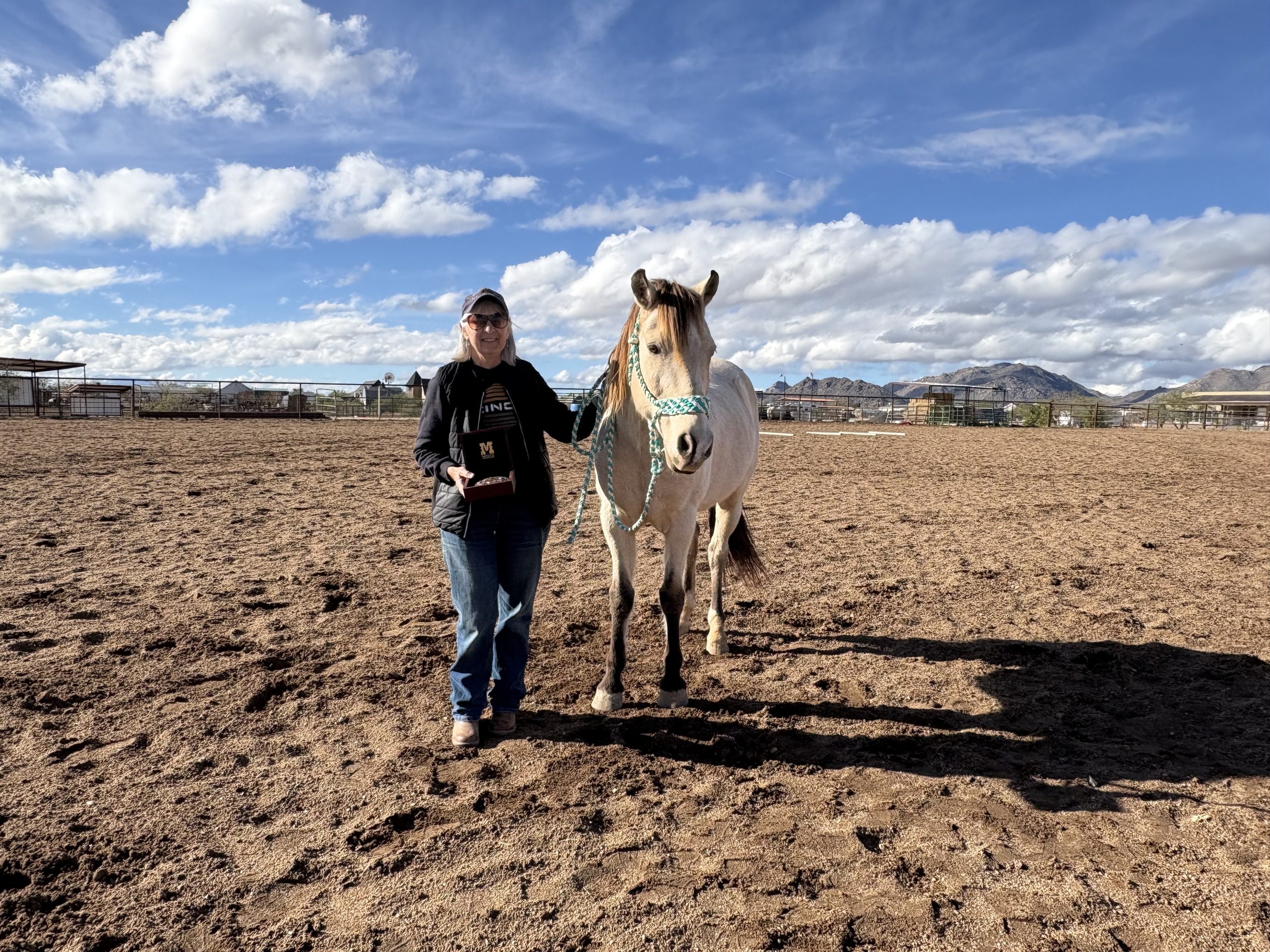 What a great visit from one of my very favorite horses! Bandit and his owner Janice Gifford spent a week with us this month. We rode the desert trails, and on the L Bell Ranch in Skull Valley, Az . Janice wanted a cactus picture and we took many! They worked hard in the arena and with a trainer to polish their ranch riding skills and it paid off when they won ranch riding and ranch conformation classes shortly after returning home to Washington. We had so much fun and can’t wait for this talented team to come back!